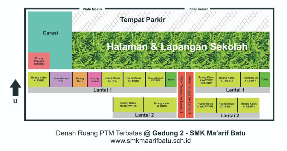 Berikut Denah Ruang PTM Terbatas yang dilakukan di Gedung 2 SMK Ma’arif Batu Jl. Hayam Wuruk Desa Oro – Oro Ombo Kota Batu